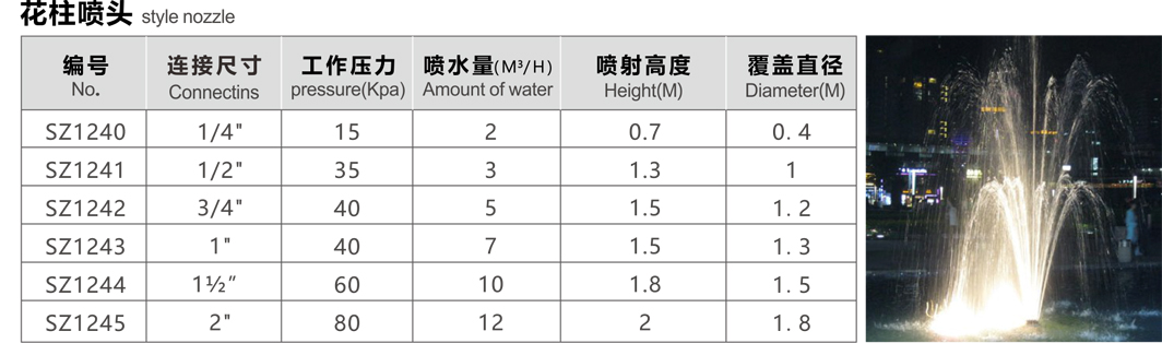 特点:由中心直上和二圈不同层次的直流喷嘴组成,喷嘴形成中心水柱和两层外向辐射的抛物线状水花。